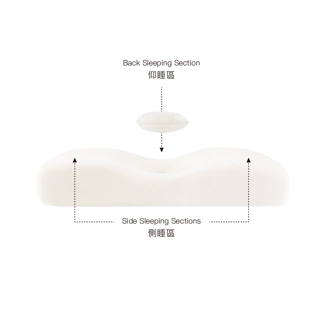 • 枕頭的中心設計可在仰睡時支撐您的頭部,兩側凸起可在側睡時支撐頭部。